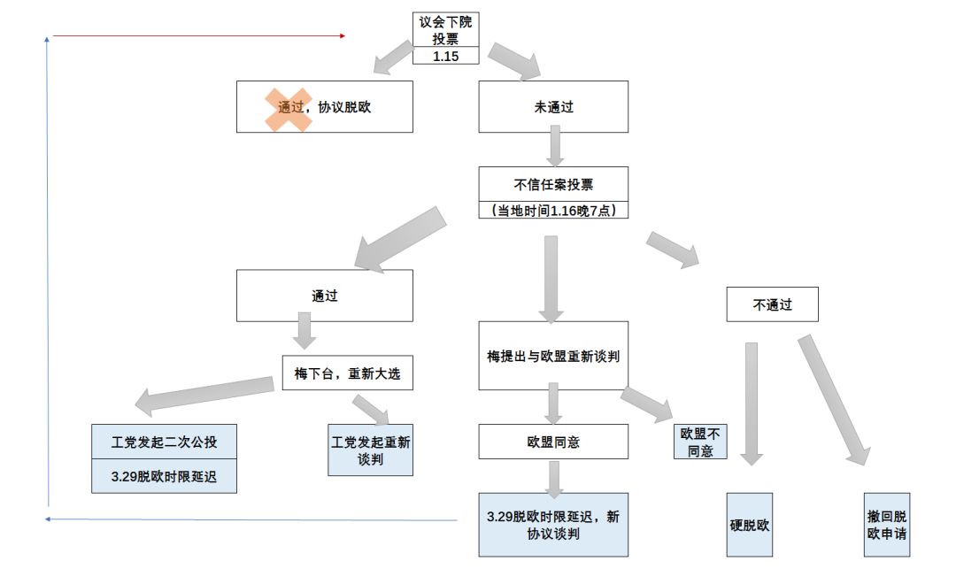 1. 梅继续斡旋求得延期。梅政府可在3个议会工作日内(1月21日)提交“备用方案”。如果获得批准,可向欧盟提出要求推迟正式脱欧的日期(2019年3月29日)并继续谈判。然而被否的脱欧协议已然是目前英国与欧盟之间唯一一份“既定协议”,梅的备用方案也只能是在当前协议上略加修改。除非欧盟对一部分协议条款大幅妥协,否则备用方案很难被议会认可。