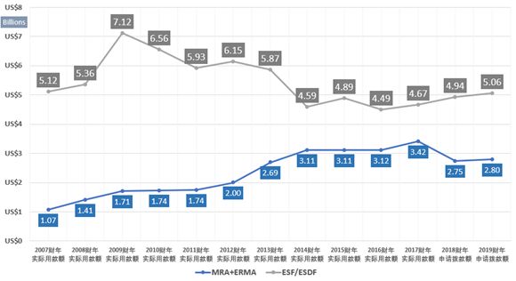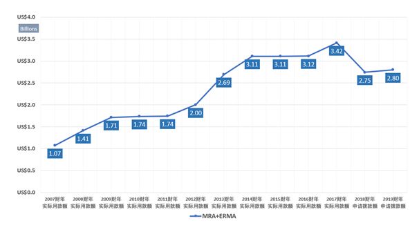 以下是2007财年—2019财年,美国MRA+ERMA资金量曲线。
