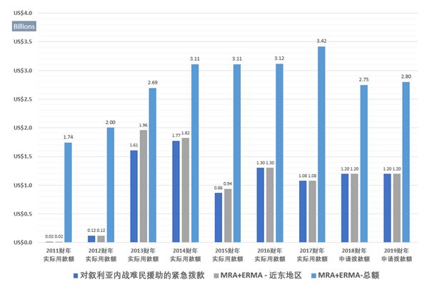 以下是美国2011财年—2019财年的MRA及ERMA在叙利亚及巴勒斯坦等内战难民区的拨款明细图。