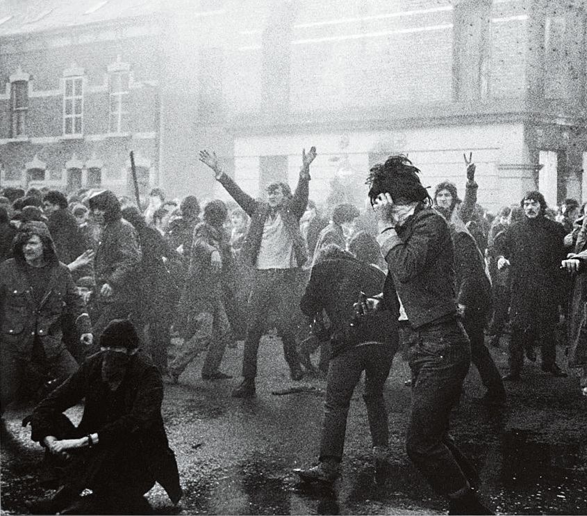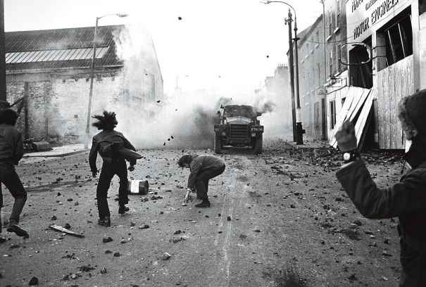 1972年1月30日,在北爱尔兰德里郡,示威的天主教徒向英国士兵投掷杂物。那一天,全副武装的英军士兵开始向手无寸铁的示威人群扫射。造成十三人死亡,十八人受伤,史称“血色星期日”。(图片来源:视觉中国)