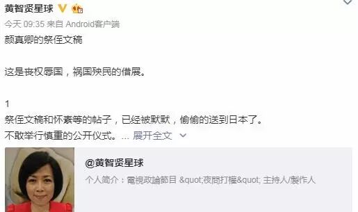 针对台北故宫将《祭侄文稿》出借日本一事,台湾名嘴黄智贤今日也在微博发文批评称,这是“丧权辱国,祸国殃民”的借展。她还说,《祭侄文稿》是全中国人的国宝,不是“台独”的战利品。