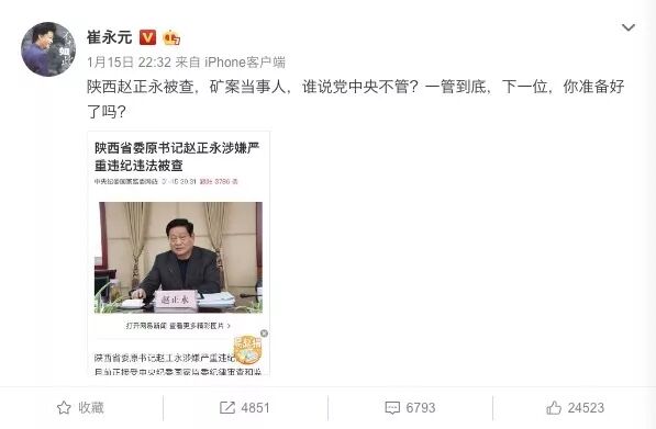 15日晚,崔永元截图赵正永被查的消息,在官方微博中评论说:“陕西赵正永被查,矿案当事人,谁说党中央不管?一管到底,下一位,你准备好了吗?”