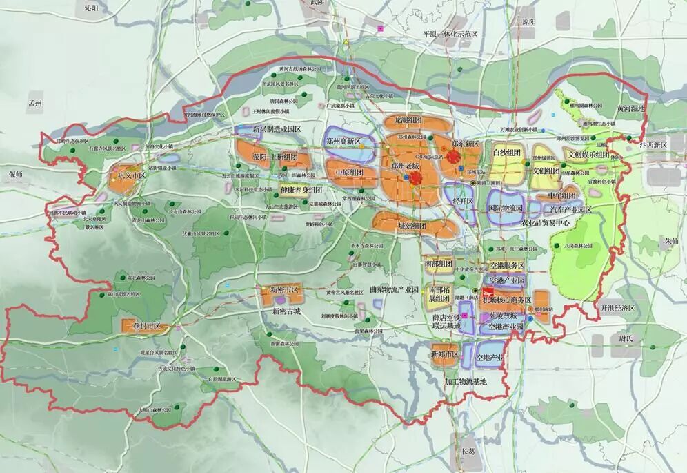 所谓“郑州大都市区”(见上图红色区域),以郑州为核心,包括郑州市域、开封、新乡、焦作、许昌四市中心城区和巩义市、武陟县、原阳县、新乡县、尉氏县、长葛市、平原城乡一体化示范区,国土总面积约1.59万平方公里,占全省国土面积的9.6%,集聚了全省近20%的人口和超过30%的经济总量,是中西部地区经济实力最强、发展速度最快的地区之一。