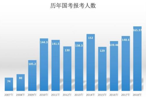 以国考为例,2018年国考报名过审人数达到165.97万人,创7年新高,平均竞争比为58:1,最激烈的岗位达到2931:1。