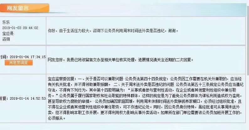 宝应县公务员在扬州市长信箱留言中,咨询因生活压力大利用周末送外卖是否违纪。