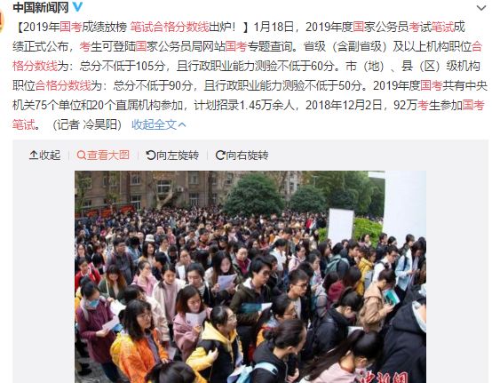 2019年的国考中,共有中央机关75个单位和20万直属机构参与,计划招录1.45万余人,参加国考笔试的考生有92万,招录比仅仅1.57%。