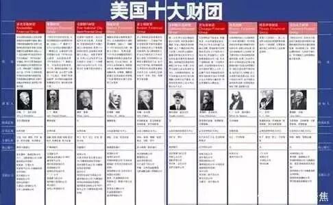 此后,随着一战和二战的爆发,美国的托拉斯组织纷纷从金融、军事、能源等领域入手,进而跟国家实现了高度融合(绑架),并最终形成了十大财团,即洛克菲勒财团、摩根财团、第一花旗银行财团、杜邦财团、波士顿财团、梅隆财团、克利夫兰财团、芝加哥财团、加利福尼亚财团、得克萨斯财团。