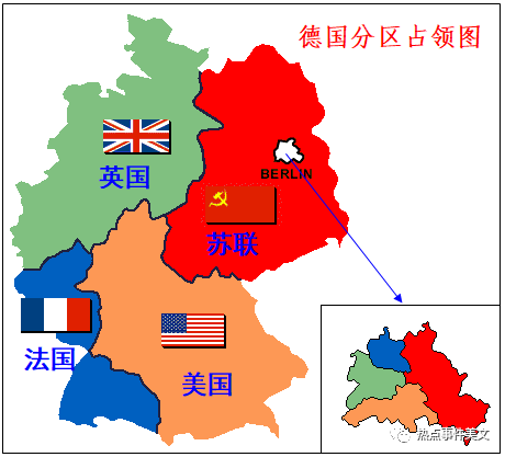 1945年5月,德国战败被盟军占领,根据协定和商议,1945年6月,美、苏、英、法四国驻德占领军总司令在柏林正式声明把德国分成 4个部分,东区归苏联、西北区归英国、西南区归美国、西区归法国,“大柏林”区由四国共同占领。