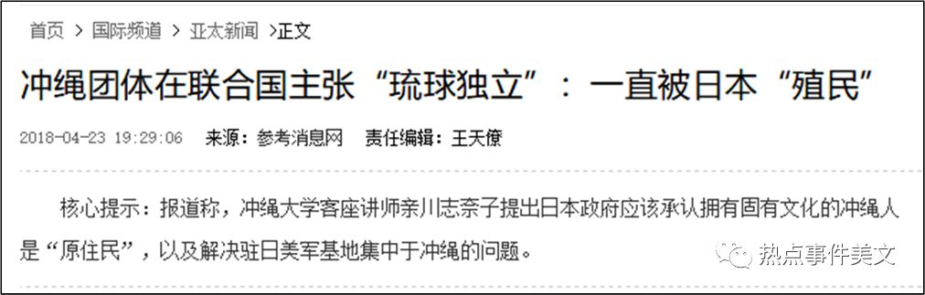 4月23日报道,港媒称,日本冲绳县团体“琉球民族独立综合研究学会”,在纽约联合国总部举行的“原住民议题常设论坛”上,主张“琉球独立”,并要求日本政府承认“冲绳人是原住民”,但被拒绝。
