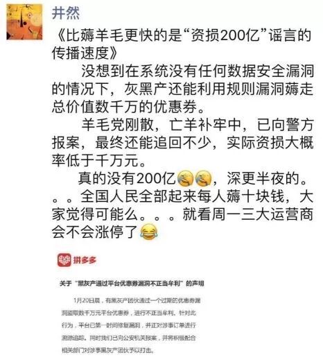 拼多多方面否认损失200亿,但在声明里也强调“有黑灰产团伙通过一个过期的优惠券漏洞盗取数千万元平台优惠券,进行不正当牟利。”