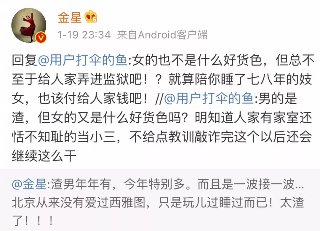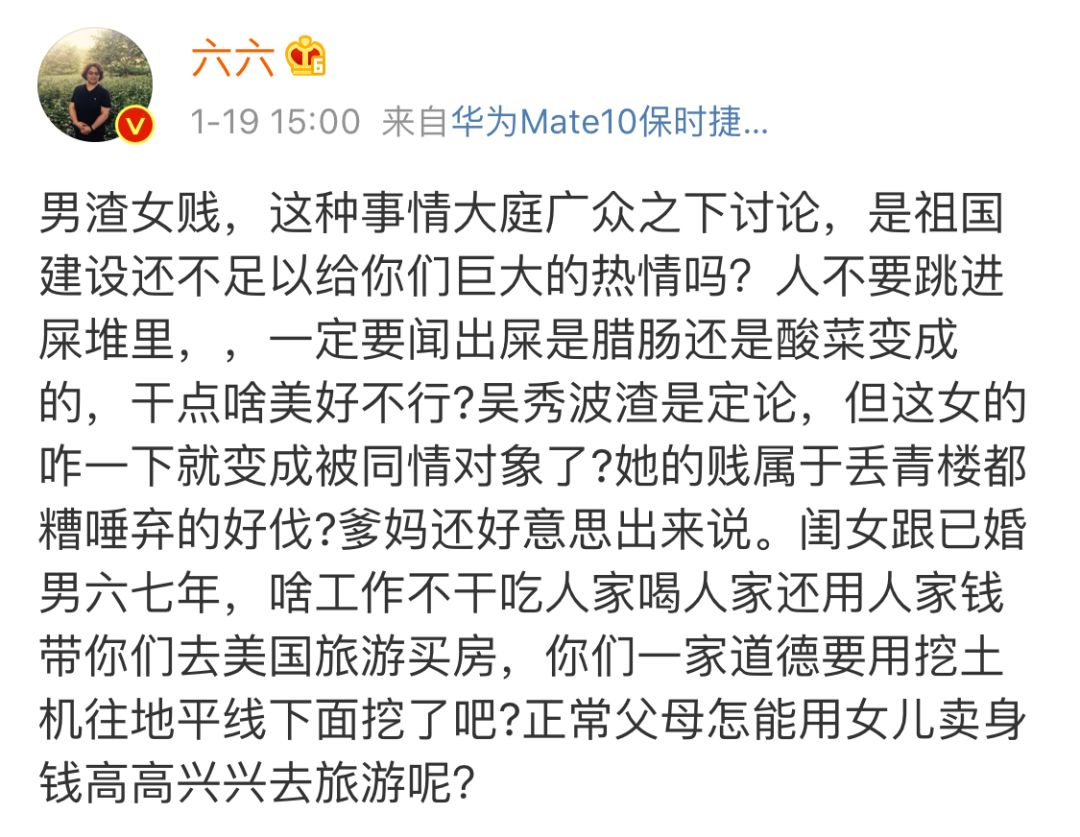 王思聪、黄毅清、金星、六六相继登场,我个人认同作家六六女士的评论——渣男贱女,都不值得同情。
