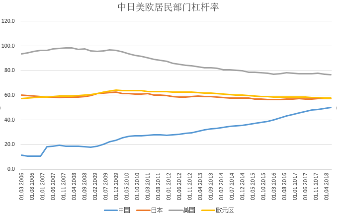 在三大部门的杠杆中,非金融企业的杠杆率,在四大经济体中,中国已排在首位,加无可加,所以才有这几年的去杠杆。居民部门的杠杆率这几年迅速飙升,快速冲顶,接近全球几大经济体的水平。