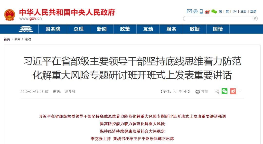 1月21日傍晚,新华社播发了中央召开“省部级主要领导干部防范化解重大风险专题研讨班”的新闻通稿。