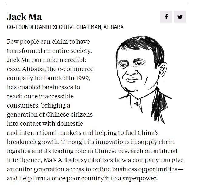 而马云跻身这一榜单,也意味着他已经不仅仅是个成功的企业家,更是时代的塑造者。