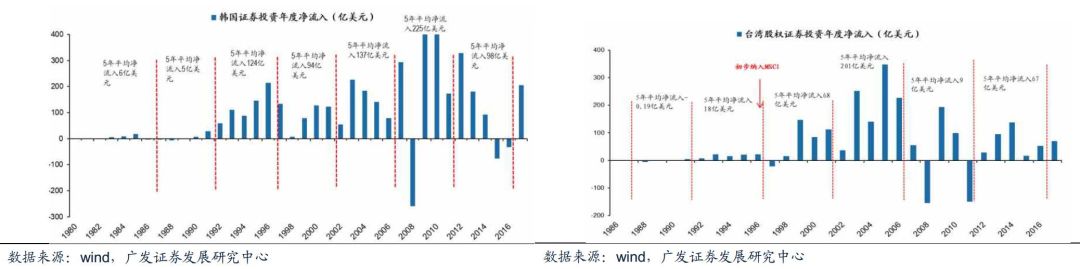 韩国台湾股市的资金流入主要变化在纳入MSCI指数。韩国和台湾股市先后在1992年和1996年首次纳入MSCI,所以1992年和1996年分别成为了其资本市场发展的重要节点。