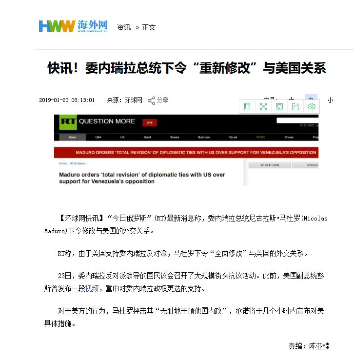 1月23日,委内瑞拉宣布“重新修改”与美国关系,其总统抨击美国“无耻地干预了委内瑞拉内政”,并宣称在未来几个小时,将对美国采取具体措施。