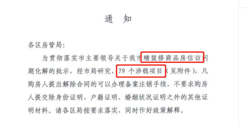 对于79个涉稳楼盘项目,凡购房人提出解除合同的可以办理备案注销手续,而且不要求购房人提交除身份证明、户籍证明、婚姻状况证明之外的其他证明材料。