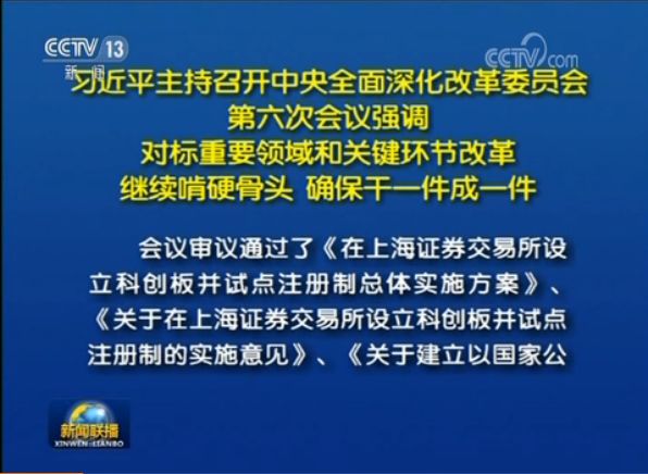 “中央全面深化改革委员会第六次会议”通过了《在上海证券交易所设立科创板并试点注册制总体实施方案》、《关于在上海证券交易所设立科创板并试点注册制的实施意见》。
