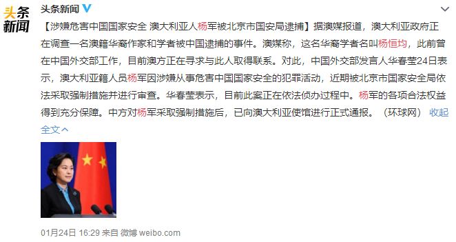 【环球时报-环球网报道 记者 白云怡】据澳媒报道,澳大利亚政府正在调查一名澳籍华裔作家和学者被中国逮捕的事件。澳媒称,这名华裔学者名叫杨恒均,此前曾在中国外交部工作,目前澳方正在寻求与此人取得联系。在24日的外交部例行记者会上,有外媒就杨恒均的问题进行提问。对此,中国外交部发言人华春莹表示,澳大利亚籍人员杨军因涉嫌从事危害中国国家安全的犯罪活动,近期被北京市国家安全局依法采取强制措施并进行审查。