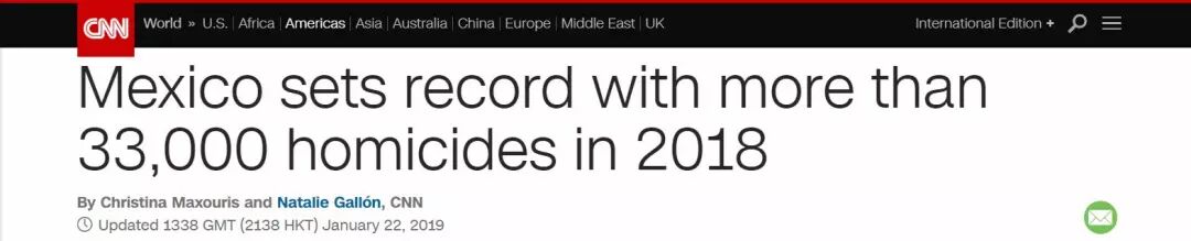报道称,根据墨西哥安全与公民保护秘书处(secretary of Security and Citizen Protection)发布的一份报告,2018年墨西哥共发生33341起凶杀案。相比2017年的28866起,增幅超过15%。