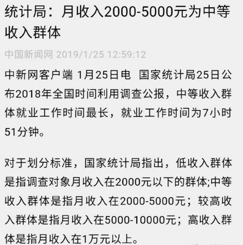 所以,这次统计局将全国人口划分为4个群体,月入2000以下为低收入群体,月入2000~5000为中等收入群体,月入5000-10000为较高收入群体,月入一万以上为高收入群体,我觉得划分的并没有啥问题,月入2000~5000已经碾压了80%以上的中国人了,划定为中等收入群体没什么不妥。