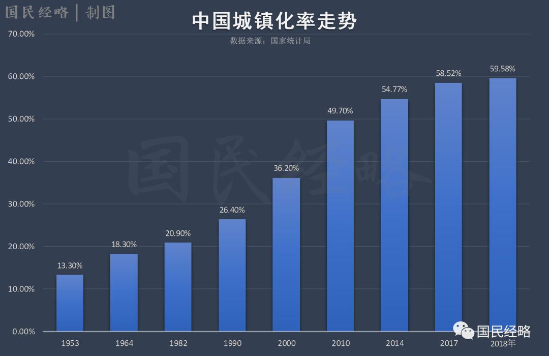 1953年,我国城镇化率仅为13.3%,直到30年后的1982年,也仅有20.9%。从1982到2018年,则从20.9%增加到59.58%,接近三倍。
