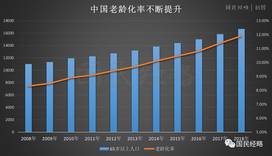 而65岁以上人口,从2008年的1.1亿人增加到1.66亿人。10年时间,多了5600万人。