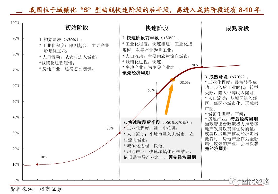 数据显示,2018年中国城镇化率为59.58%,离70%的城镇化率上限,距离越来越近。一般认为,城镇化率从30%上升到70%的过程,是经济快速发展的黄金时期,也是房地产市场繁荣的支撑之一。