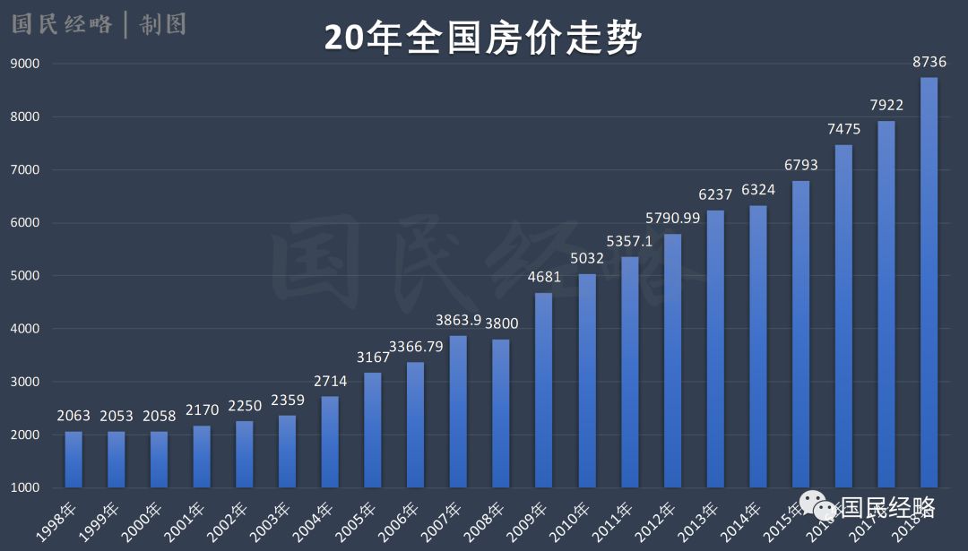 将时间跨度拉长到20年,从1998年到2018年,全国商品房均价从2063元攀升到8736元,涨幅为323.5%。