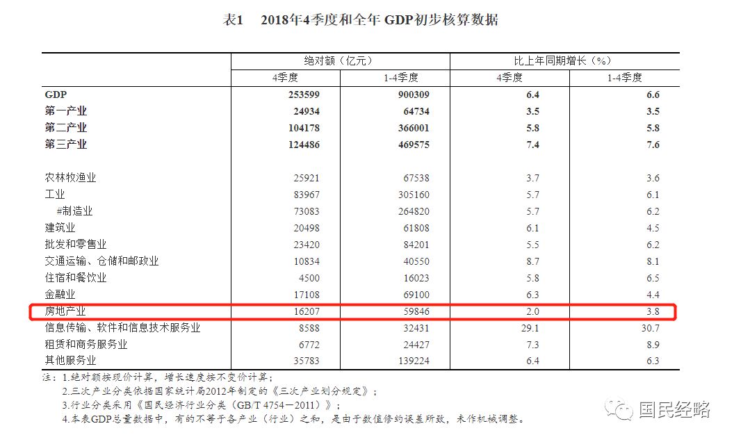 2018年全年房地产行业增加值绝对额为59846亿元,比上年同期增长3.8%。其中四季度增加值绝对额为16207亿元,比上年同期增长2.0%,创下2015年二季度以来的新低。