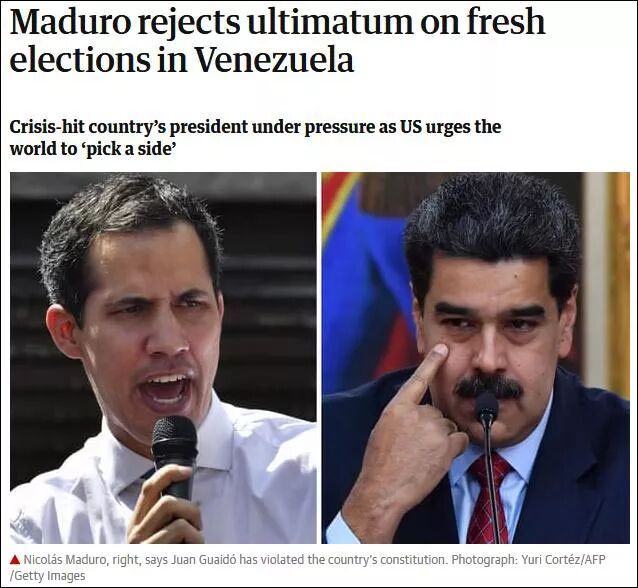 26日(周六),西班牙首相桑切斯、法国总统马克龙、德国政府发言人,以及英国外交部长亨特,先后发表声明,要求委内瑞拉重新选举,否则拒绝承认马杜罗政权,承认瓜伊多的“临时总统”身份。