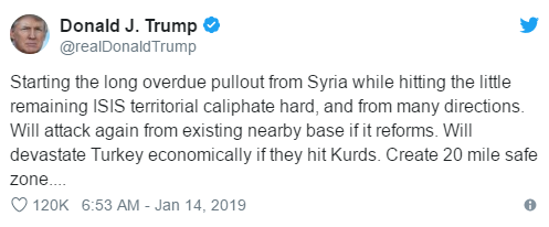 面对急不可待要进军库尔德人控制区的土耳其,特朗普还在一月中旬发了这么一条推特