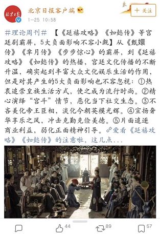 上周星期五,《北京日报》专文批判甄嬛传、步步惊心、芈月传、延禧攻略、如懿传等宫斗剧。文章内容从五大方面批评了宫斗剧给社会造成的恶劣影响: