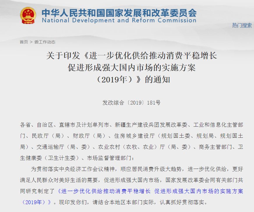 这份文件的正式名称是:《进一步优化供给推动消费平稳增长促进形成强大国内市场的实施方案(2019年)》。