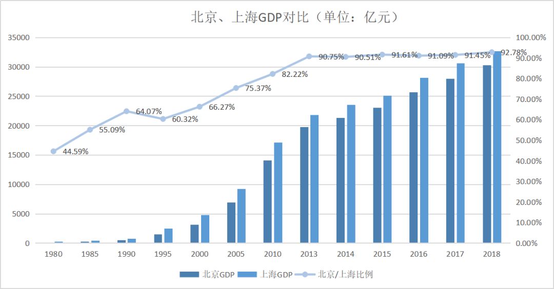 2018年,北京GDP相当于上海的92.78%,为建国60年以来最高。不过,这个历史性的进程即将宣告结束。