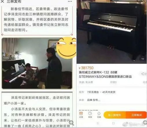 先来看看这台价值38万的钢琴,前几天,上海市浦东新区政府官员去慰问当地的困难户家庭,并拍照报道作正面宣传。但没想到的是,配图居然配了困难户小汤用钢琴给书记演奏《感恩的心》的壮观场面,也许书记觉得小汤弹的很好,曲名也很应景,就很高兴的让这张图上报纸了。