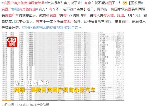 官方声称,开奥迪奔驰,未必就不符合贫困户条件。听到这话我就醉了,开奥迪奔驰的居然符合贫困户条件,那外面那些望着奥迪奔驰流口水的人怎么办,他们能来拿贫困户补贴么?