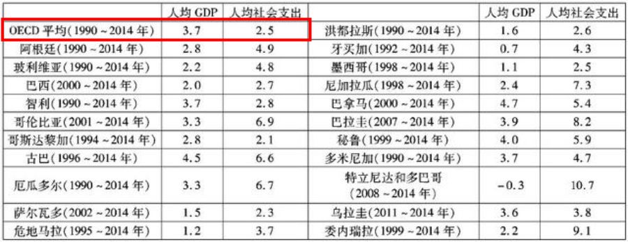 下面这张图里,大部分拉美国家人均GDP低于经合组织(OECD)国家,但是人均社会支出却普遍要高很多。