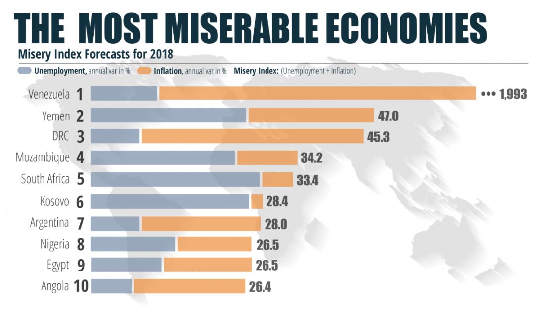 在2018年“痛苦指数”排名中,委内瑞拉以1993“爆表得分”位居榜首,阿根廷也位居前10。