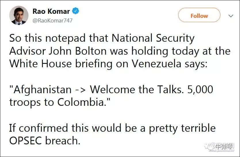因为按照美国媒体的报道,这本记录本的主人,是白宫安全顾问博尔顿出席记者会,1月28日,他带着这个记录本回答记者们有关委内瑞拉局势问题。