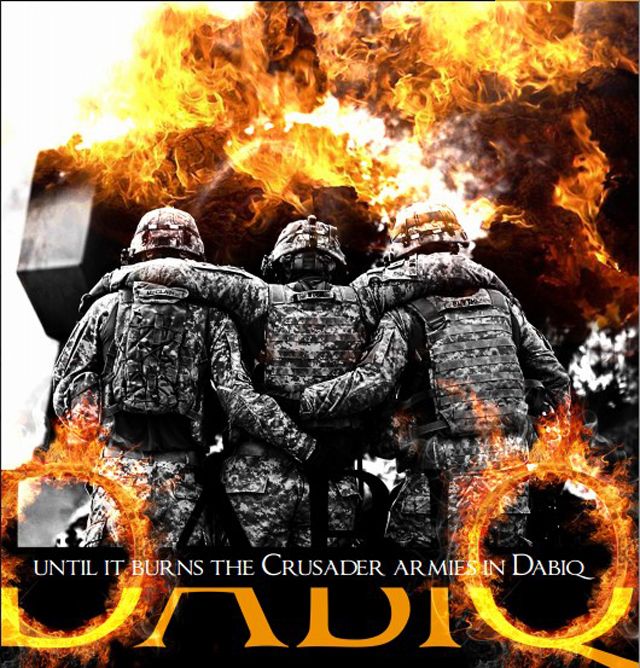 还有一个刁钻的角度来说明这件事——“伊斯兰国”曾经的宣传能力十分出众,它出版的杂志《Dabiq》封面设计精美,含义丰富。比如下面这张就是它影响力还很大的时候的封面,看看这设计水平,p图能力。瞧瞧这壮观的天火,仿佛真和底下那一行英语字说的那样“直到在Dabiq烧掉那些十字军(指美国为首的西方联军)”。