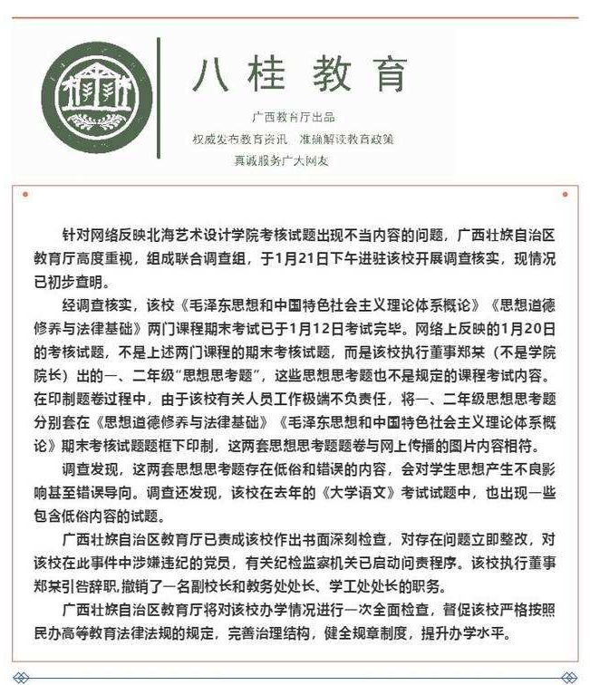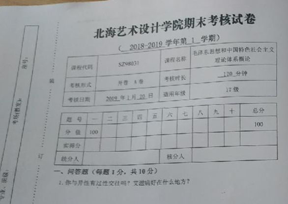 1月20日,在多名网友的爆料下,当天广西北海艺术设计学院的《毛泽东思想和中国特色社会主义理论体系概论》的期末试题,成为了网络热议的话题。