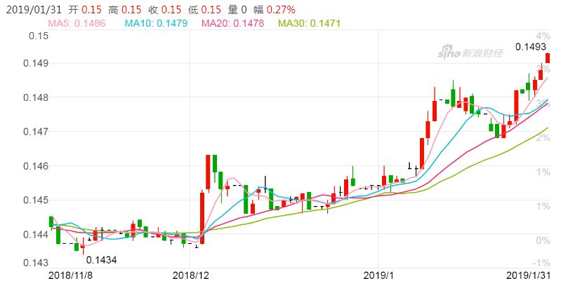 如果你看不习惯“下跌代表升值”,可以看下面这幅图,显示的是人民币对美元走势,也就是1元人民币等于多少美元。上升代表人民币升值。