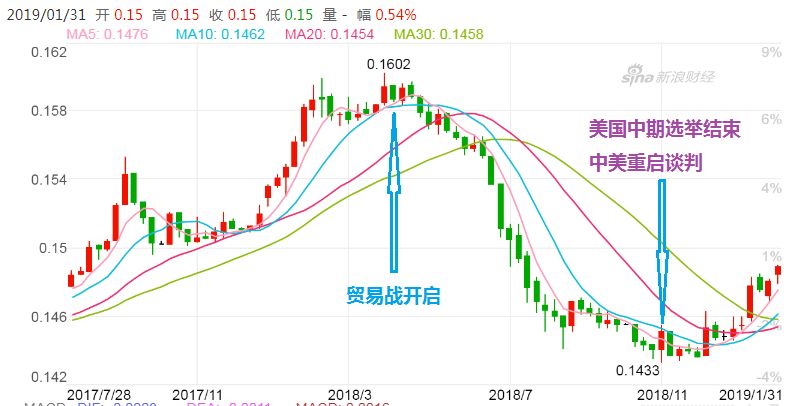 再看上图,是人民币对美元(1人民币等于多少美元)的周K线,可以看出一年来的变化。第一个节点是2018年4月,当时“博弈全面开始”,双方相互开“加税清单”,这时候人民币汇率走了一波贬值周期。拐点在哪里?11月初,就是中期选举前后开始升值,直到今天。