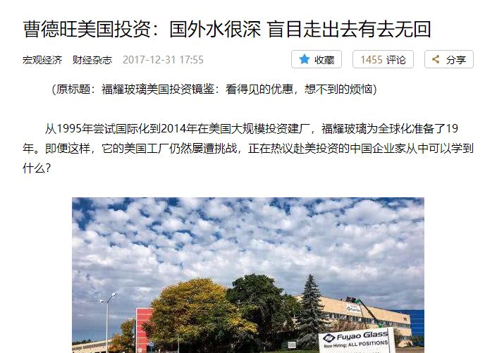财经杂志那篇《福耀玻璃美国投资镜鉴:看得见的优惠,想不到的烦恼》报道向我们呈现了曹总在美国投资的烦恼。为什么曹总投资的时候没有烦恼?因为那个时候,他算账之后发现“在美国办厂比在中国利润高”。然而,到那之后发现,你赚了钱,接踵而至的行政罚款你受不了,美国的工会阻挠让你的生产完全无法像中国那样开展,而且在美国熟练工人非常难找,蓝领工人工资非常之高。报道中说,曹总感叹“(对于美国工厂)有时候我会沮丧得快要昏过去”。