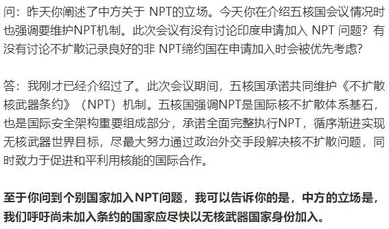 看到没有?至于你问到个别国家加入NPT问题,我可以告诉你的是,中方的立场是,我们呼吁尚未加入条约的国家应尽快以无核武器国家身份加入。