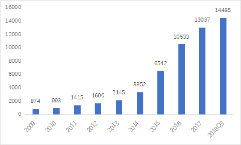 近几年上市公司并购重组愈发活跃,A股商誉规模呈现出爆发式增长。据统计,2008年A股商誉水平仅800亿元左右,2013年这个数字还是2145亿元,真正爆发是在2014年,一路飙升。截至2018年三季度,全A股商誉已经飙到了1.45万亿元,占净资产比例高达3.73%。