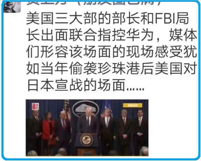 昨天美国已经正式启动引,渡孟女士的司法程序,美国三大部部长以及FBI局长一同出面展开联合指控。一切的信号都证明,这场指控无关商业犯罪,纯粹是政治手段。有些中国叫兽和网络大V极为振奋!他们兴奋地表示:“现场如此震撼,一如当年美国被珍珠港偷袭之后对日宣战的场面。”
