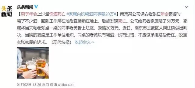 就在本月初,新年钟声刚过,多家媒体报道称,南京一男子在公司年会上过量饮酒,回到工作所在地后,被同事发现已经死亡。