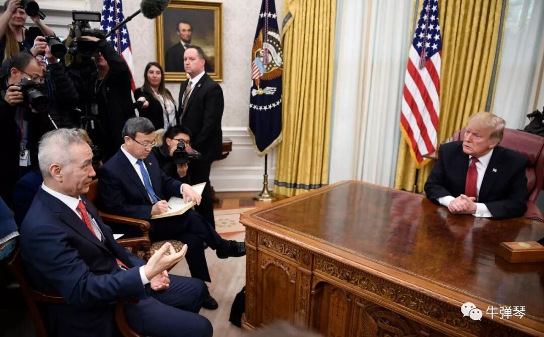 阵仗不是一般的大,特朗普坐在办公桌后,对面是大批的记者,刘鹤副总理在他的右前方,他的左手边: